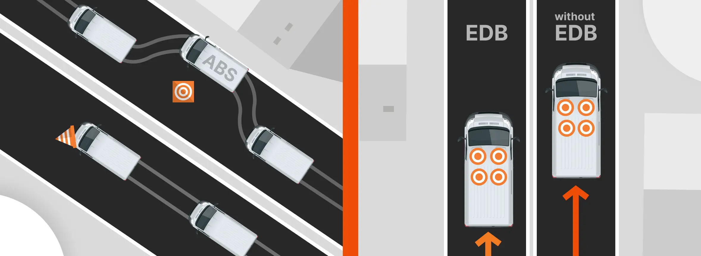 Системы предотвращают блокировку колёс и распределяют тормозное усилие между передней и задней осью автомобиля, сохраняя устойчивость и управляемость автомобиля в условиях нарушения сцепления колёс с дорожным покрытием.